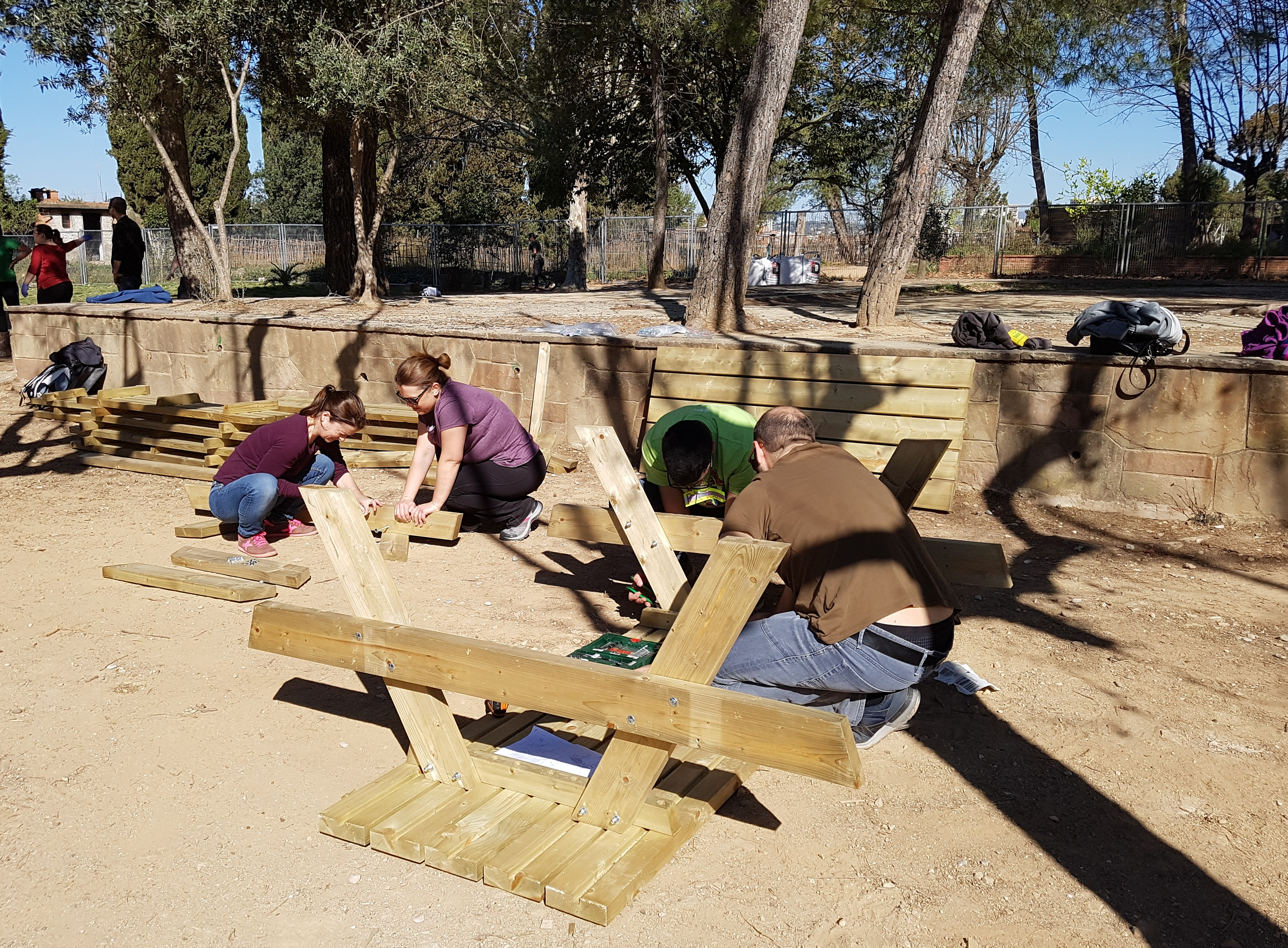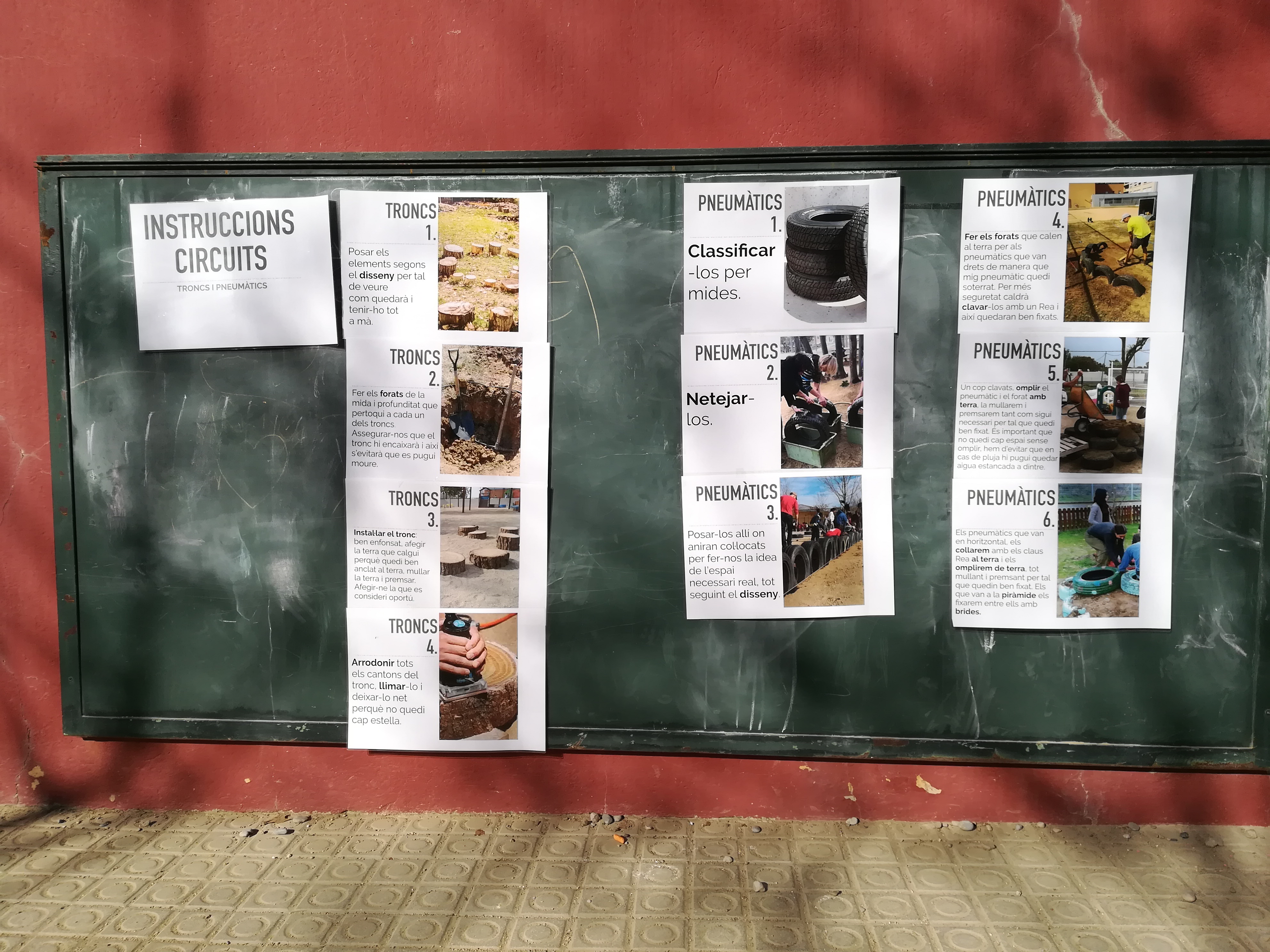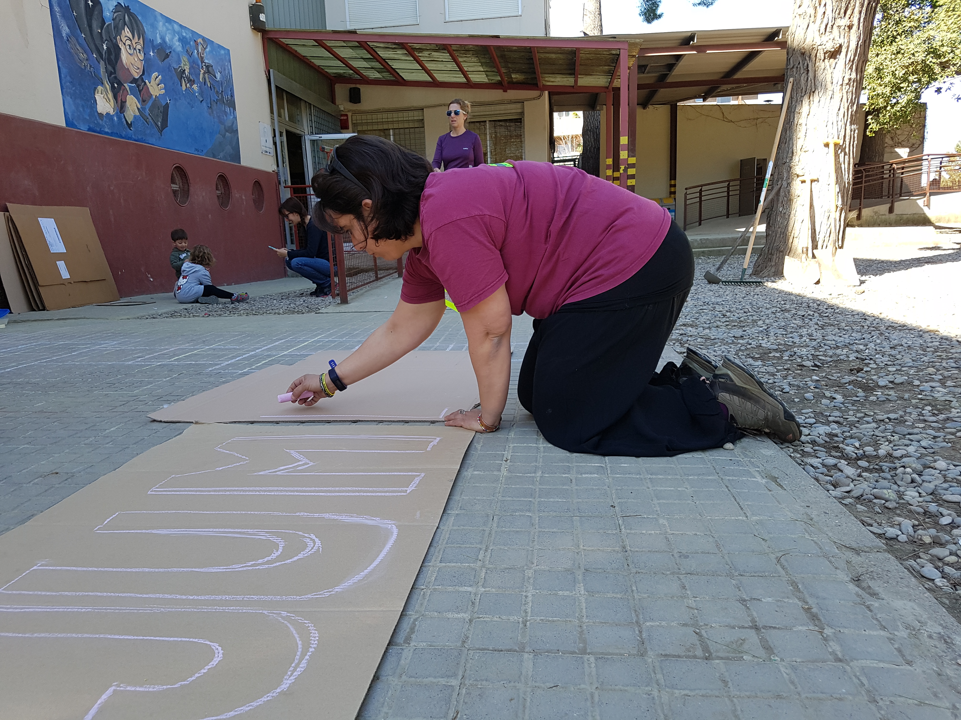 Arribem a l’escola, fa molt bon temps. Encara som poquets, la resta de la gent trigarà una estona a arribar. Ho enllestim tot, ens distribuïm les tasques i som-hi!