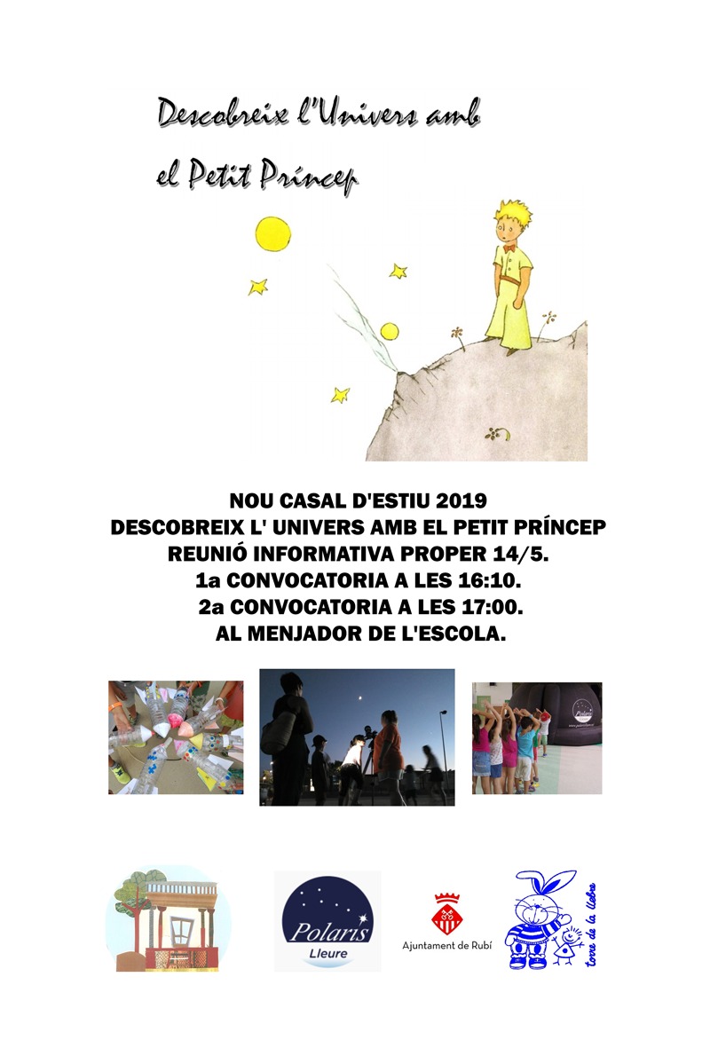 S’acosta l’estiu i hem de buscar activitats divertides per als nostres fills i filles. L’AMPA us vol comunicar que hem canviat d’empresa de casals i aquest any ens estrenem amb Polaris Lleure i el seu projecte “Coneix l’univers amb el Petit Príncep”. Enguany, l’oferta podria incloure també l’última setmana de juny i les dues primeres de setembre (subjecte a quina sigui la demanda).