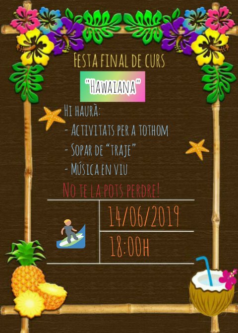 El divendres 14 de juny, doncs, l’escola es convertirà en la Honolulu del Vallès i tots ens transportarem a les platges paradisíaques de Hawaii, gaudint de l’ambientació, els refrescos, els jocs i els balls d’aquesta illa.